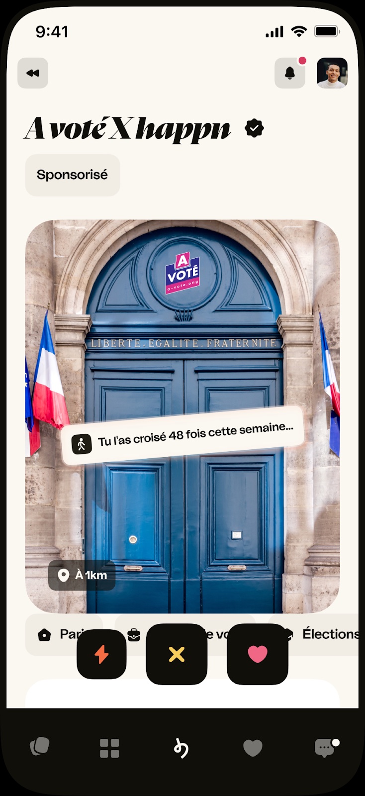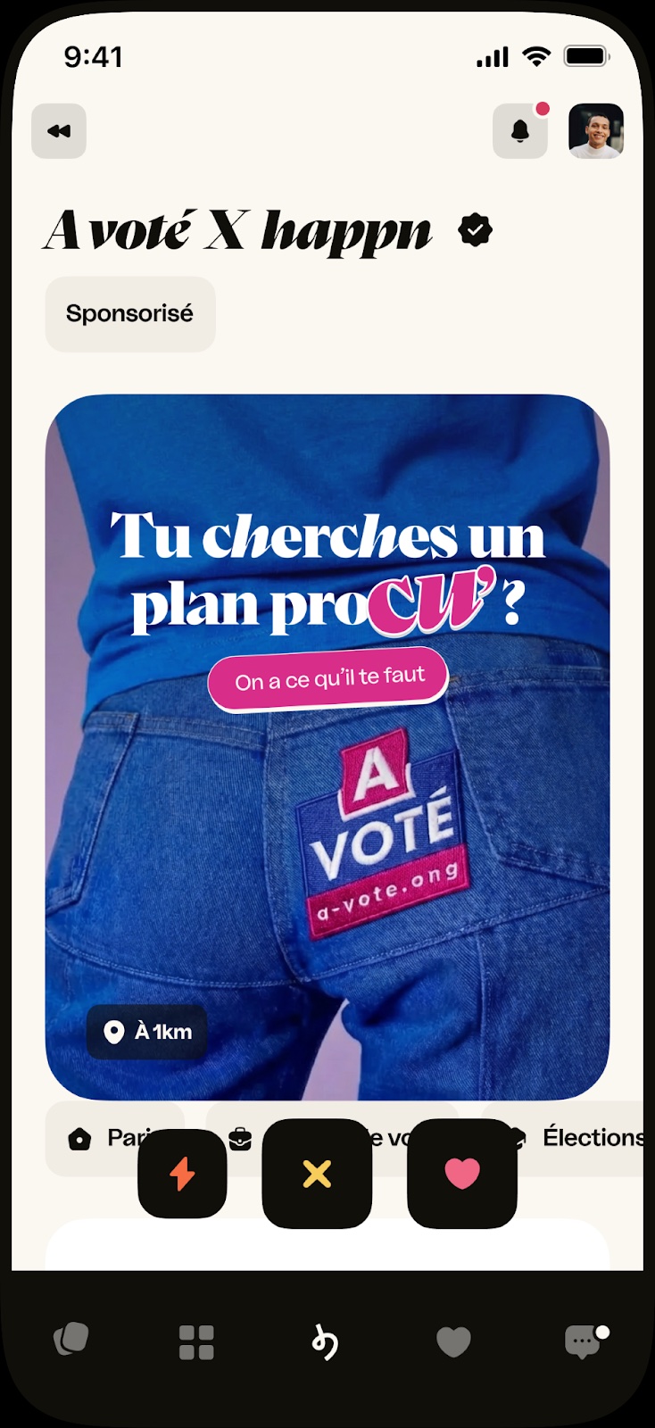 Avec happn, on montre une nouvelle fois que la démocratie peut aussi s’inviter dans des espaces inattendus, du dating aux urnes. Parce que le bon message, au bon endroit, peut faire la différence. Ensemble, faisons reculer l’abstention en France !